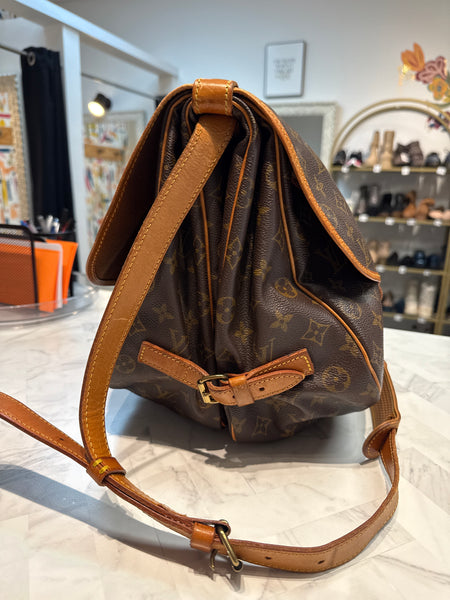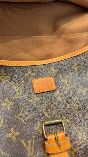 Width (at base): 13.75" Height: 12" Depth: 9" Shoulder Strap Drop: Adjustable, 20" Circa: 1993 Type of Material: Coated Canvas, Leather Color: Brown Lining: Brown Fine Textile Pockets: Three Interior Hardware: Gold Tone Closure: Buckle