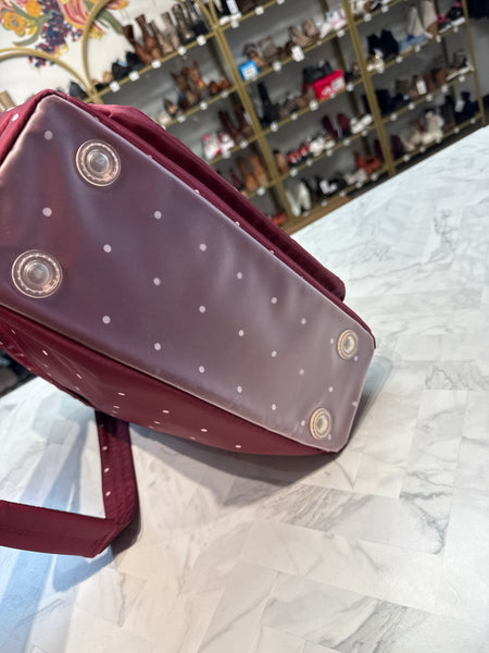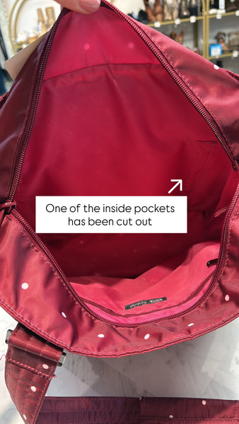 Soft lined digital accessory pocket (5"W x 7"H) - Slim hidden magnetic pocket for magazines - RFID protected upper front pocket features 2 pen holders and soft lined cargo pocket - Lower zip pocket offers quick access to misc. accessories - Zippered insulated pocket on back side (10"W x 11"H) - Luggage strap that slides onto standard suitcase handle - 2 side cargo pockets - Main interior has cargo pocket, slim zip pocket - Gun metal finish hardware - Wipeable bottom - Material specially treated with water-repellent finish - Dimensions: 15"W x 14"H x 4.5"D