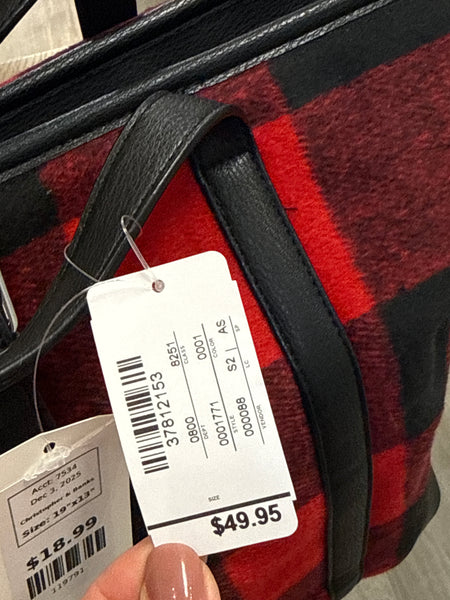 New Christopher & Banks Red/Black Plaid Tote Bag, 19"x13"