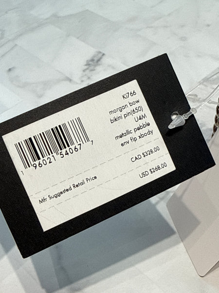 Small sized bag; 8-3/4"W x 5"H x 2"D (width is measured across the bottom of handbag) - Chain strap - Snap closure - Gold-tone hardware, bow embellishment & logo, interior card slots - Leather