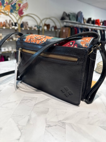 New Patricia Nash Black Leather Tapestry Cross Stitch Crossbody Bag, 9"x6"