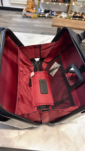 - Zipper closure, backstrap attaches to most luggage handles, detachable shoulder strap, frosted satin finish